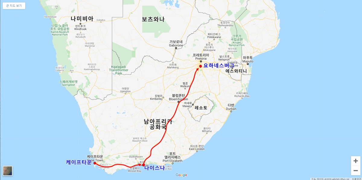 남아공의 대표 관광도시인 케이프타운에서 희망봉과 테이블마운틴 등을 둘러본 후 시간이 없어 남쪽에 있는 나이스나와 요하네스버그만 살짝 여행했다. 몇 년 전에 수도 프레토리아, 소웨토 등 몇 군데를 여행한 적이 있긴 하다.
